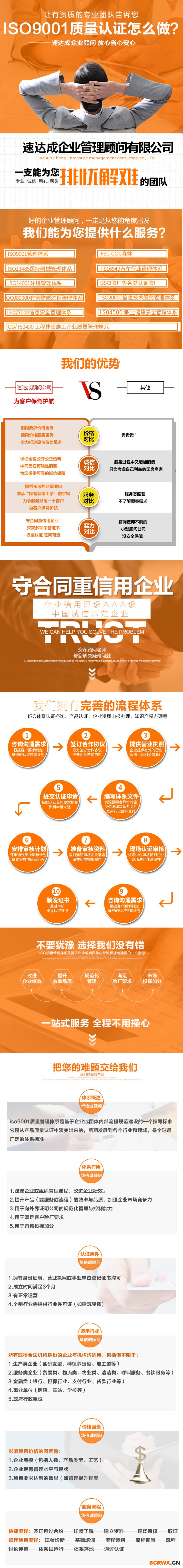 從事ISO認證咨詢,ISO9001認證,ISO14001認證,OHSAS18001認證。各類榮譽的代辦,如:AAA企業(yè)信用評級、誠信示范單位/企業(yè)等等。