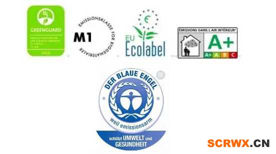 左起:美國綠色衛(wèi)士認證、芬蘭M1認證、歐盟之花認證、法國VOC認證、德國藍天使認證(最嚴格的環(huán)保認證)