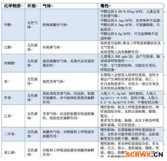 大部分吃瓜群眾提起裝修污染,話題都離不開甲醛,每天新聞里報道的也大多是甲醛超標危害人體健康,很多商業(yè)在推銷產(chǎn)品時也喜歡拿甲醛說事兒。然而真相是,甲醛并不是唯一的有害物質(zhì),它僅僅是裝修污染“黑惡勢力”團伙中的一員!見下表↓↓↓