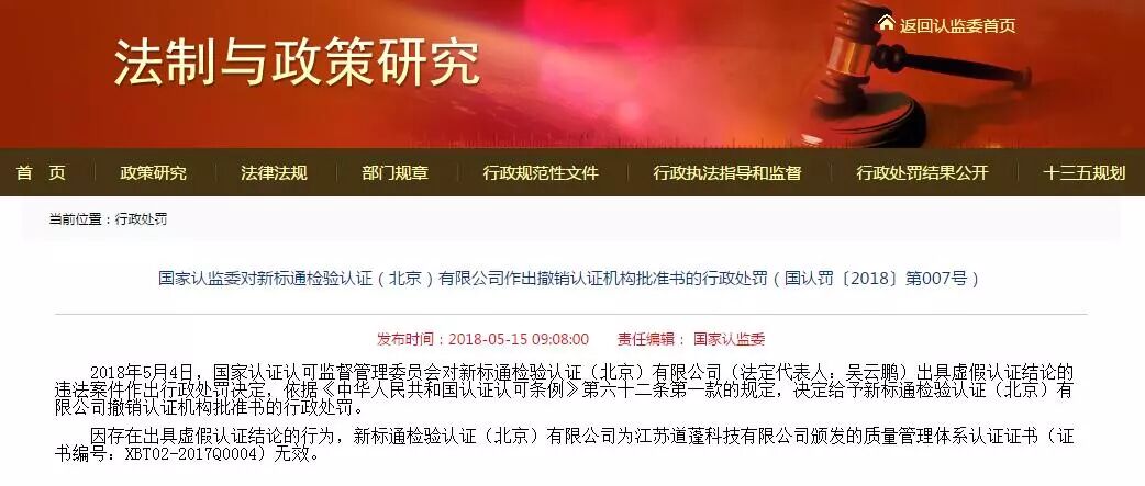 2018年5月4日,國家認(rèn)證認(rèn)可監(jiān)督管理委員會對新標(biāo)通檢驗(yàn)認(rèn)證(北京)有限公司(法定代表人:吳云鵬)出具虛假認(rèn)證結(jié)論的違法案件作出行政處罰決定,依據(jù)《中華人民共和國認(rèn)證認(rèn)可條例》第六十二條第一款的規(guī)定,決定給予新標(biāo)通檢驗(yàn)認(rèn)證(北京)有限公司撤銷認(rèn)證機(jī)構(gòu)批準(zhǔn)書的行政處罰。
