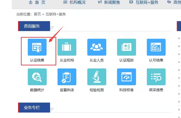 打開網站后,找到到【互聯網+服務】,點擊“管理體系與服務認證”;