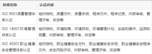總之,通過ISO 9001、ISO 14001和ISO 45001質量、環境、職業健康安全管理體系認證,組織能夠達到規范管理、提高效率、降低風險、滿足客戶要求、保障員工健康和安全的目的,最終實現業績持續改進和可持續發展。