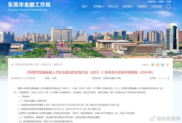 ??2024年1月11日,東莞市金融工作局發布《東莞市加強金融人才隊伍建設的實施辦法(試行)》有關獎補資金申報指南(2024年),對相關金融人才的獎勵、補貼的申報條件、標準、材料要求及流程進行了詳細的介紹和說明。
