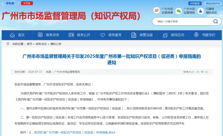 近日,廣州市市場監管局印發《2025年度廣州市第一批知識產權項目(促進類)申報指南》。